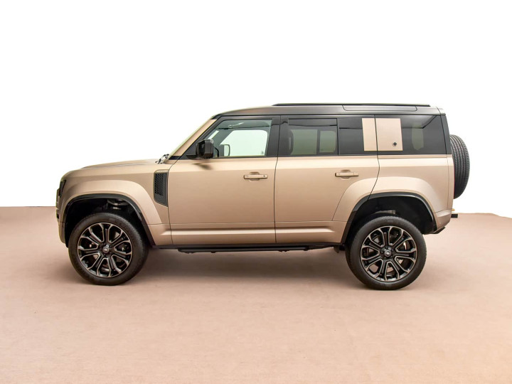 再来看车身侧面部分,车身侧面依然保持经典的“方盒子”设计,尺寸上,标准轴距版为4583×2105×1969mm(轴距2587mm),长轴距版超过5米。 相较于普通版卫士110,OCTA版本宽度增加了68毫米,离地间隙增加了28毫米,车身高度也相应提升,显得更加霸气。 后方小窗处保留了标志性的侧梯设计,新增了缎面黑侧通风口,可选配22英寸七辐轮毂,提供亮黑或哑光涂层,结合外扩明显的饱满轮眉,越野性能表现优异。 车身颜色方面,基础版提供波拉斯科灰、夏朗德灰、马尾藻蓝和佩特拉铜四种选择,BLACK版则固定搭配纳尔维克黑。